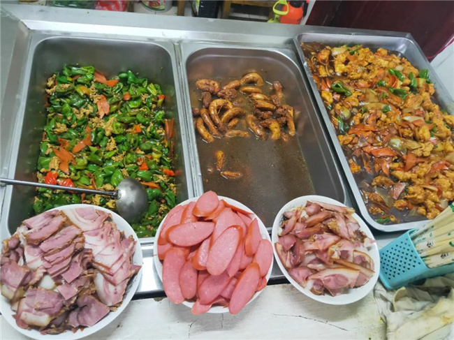 職工們發(fā)現(xiàn),車(chē)隊(duì)的職工食堂今天的伙食比往常額外增加了“硬菜”,有豬頭肉,香腸、熘肉段,醬雞脖、青椒炒雞蛋等菜品,職工們第一時(shí)間吃上醬香的豬頭肉,特別高興。
