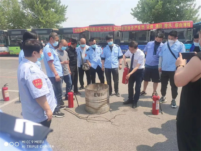 會后,在公司院內(nèi)進行實地演練,模擬公交車輛突發(fā)火災時,駕駛員在應急情況下緊急停車,疏散乘客,正確使用滅火器進行滅火等內(nèi)容。