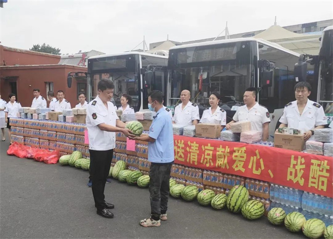 7月28日,沈北公司開展了“‘戰(zhàn)酷暑 保安全’送清涼獻(xiàn)愛心活動(dòng)”。公司工會(huì)為職工們精心準(zhǔn)備了“夏日清涼包”、西瓜、大量的礦泉水,公司負(fù)責(zé)人將“清涼”親自送到職工手中,同時(shí)叮囑車隊(duì)長(zhǎng)合理安排工作,注意防暑降溫,確保職工身體健康。