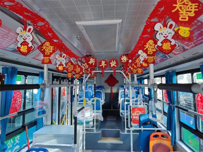 在209路車隊,車廂、站務(wù)室、辦公區(qū)域處處洋溢著喜慶的中國風(fēng),生肖窗花張貼在車窗兩側(cè),可愛的卡通兔“微笑”著向乘客們送著“祝福”,“新年快樂”的拉花昭示著中華民族的傳統(tǒng)佳節(jié)即將到來。