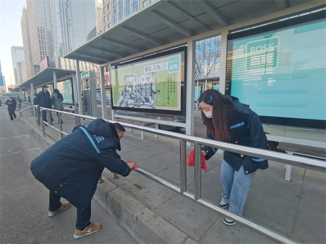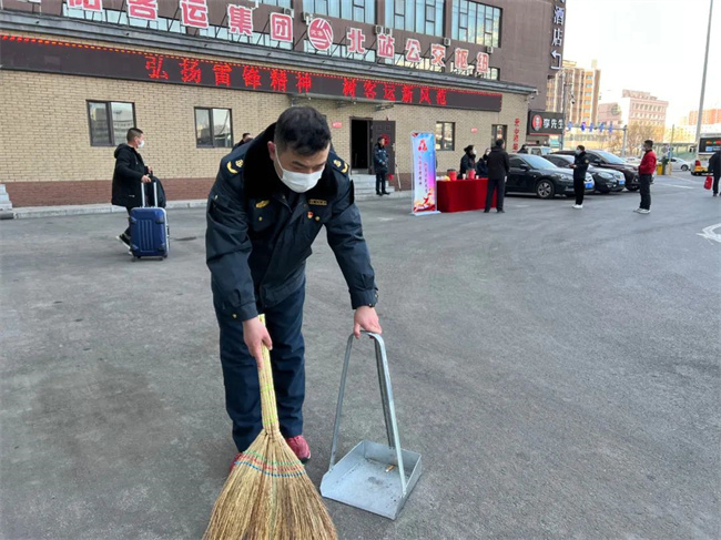 活動中,志愿者們?yōu)閬硗每椭敢较?,送上熱飲,并拿起掃把、鐵鍬等工具對垃圾、落葉等進(jìn)行清掃、分裝、清運(yùn),對公交護(hù)欄、電子站牌等衛(wèi)生死角進(jìn)行全面清理,使樞紐站內(nèi)環(huán)境衛(wèi)生煥然一新。