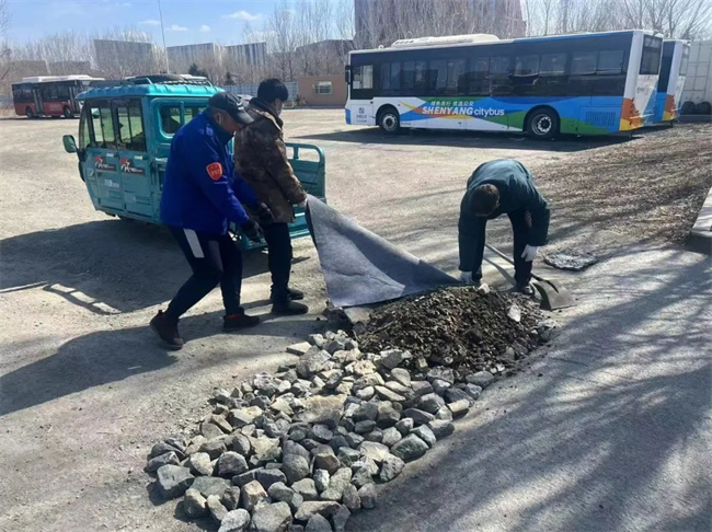 3月15日,154路車隊管理人員及駕駛員利用午間休息時間對場區(qū)大門處破損路面進(jìn)行修繕、回填,并重新鋪設(shè)。經(jīng)過大家的努力,塌陷路面修繕完畢,路面恢復(fù)平整,方便了公交車輛和行人通行,收獲好評。