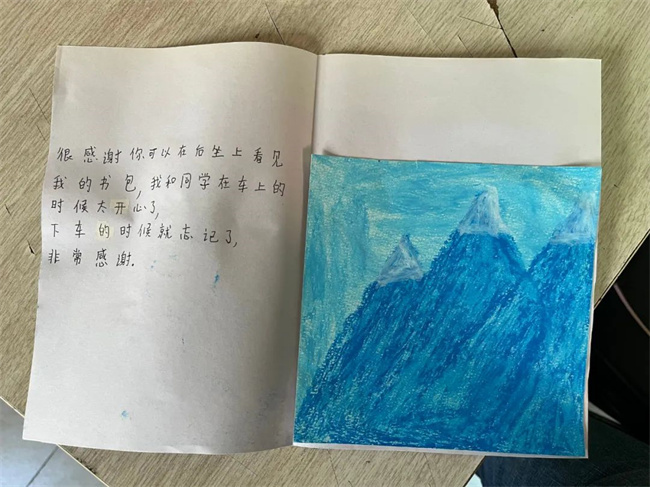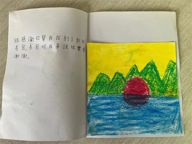 打開(kāi)這封信,是一封由小朋友自己親手制作的感謝信,信中寫道:“很感謝你在后座上看見(jiàn)我的書包,我和我的同學(xué)在車上的時(shí)候太開(kāi)心了,下車時(shí)就忘記了,非常感謝?!薄昂芨兄x你幫我找到了我的書包,書包對(duì)我來(lái)說(shuō)很重要,謝謝?!?/p>