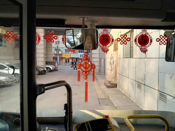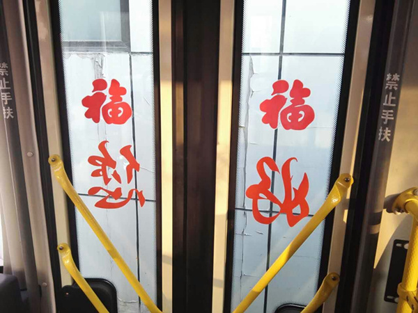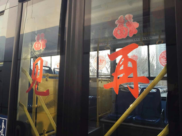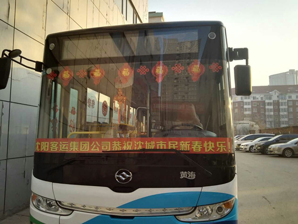 沈陽客運集團公司精心布置了車輛,粘貼了新年祝福標語、福字、窗花,懸掛中國結和小燈籠,在車廂內進行裝飾,營造出移動的溫馨家庭感覺。