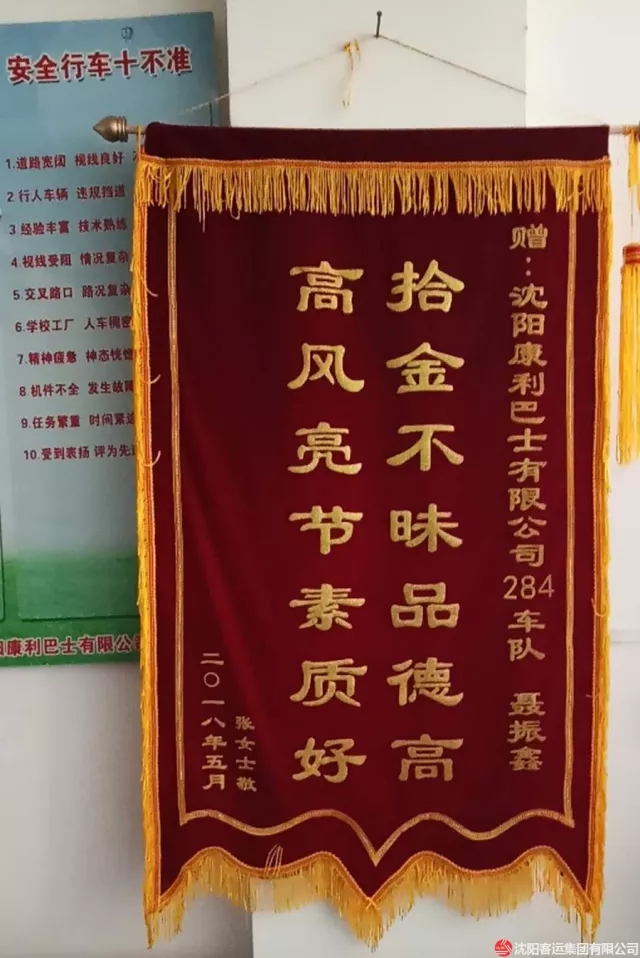 無獨有偶,還是284路車隊。5月10日,駕駛員聶振鑫在檢查車輛衛(wèi)生時,發(fā)現(xiàn)一部筆記本電腦被遺落車內(nèi),由于還要繼續(xù)行車,來不及尋找失主,便把電腦交給了車隊工作人員。失主發(fā)現(xiàn)自己電腦丟失后,抱著試試看的態(tài)度來到284路車隊,令她沒想到的是,電腦被細(xì)心的駕駛員撿到了。經(jīng)過工作人員核實,電腦的確是這位失主所有。失主對駕駛員拾金不昧的行為表示感謝,想要當(dāng)面酬謝,但被聶振鑫婉言謝絕了。對于失主的感謝,聶振鑫說:“這只是我的舉手之勞,公司經(jīng)常教育我們,拾到物品后應(yīng)該怎么處理,我只是用實際行動去傳遞社會正能量?!笔潞?,失主送來錦旗表示感謝。