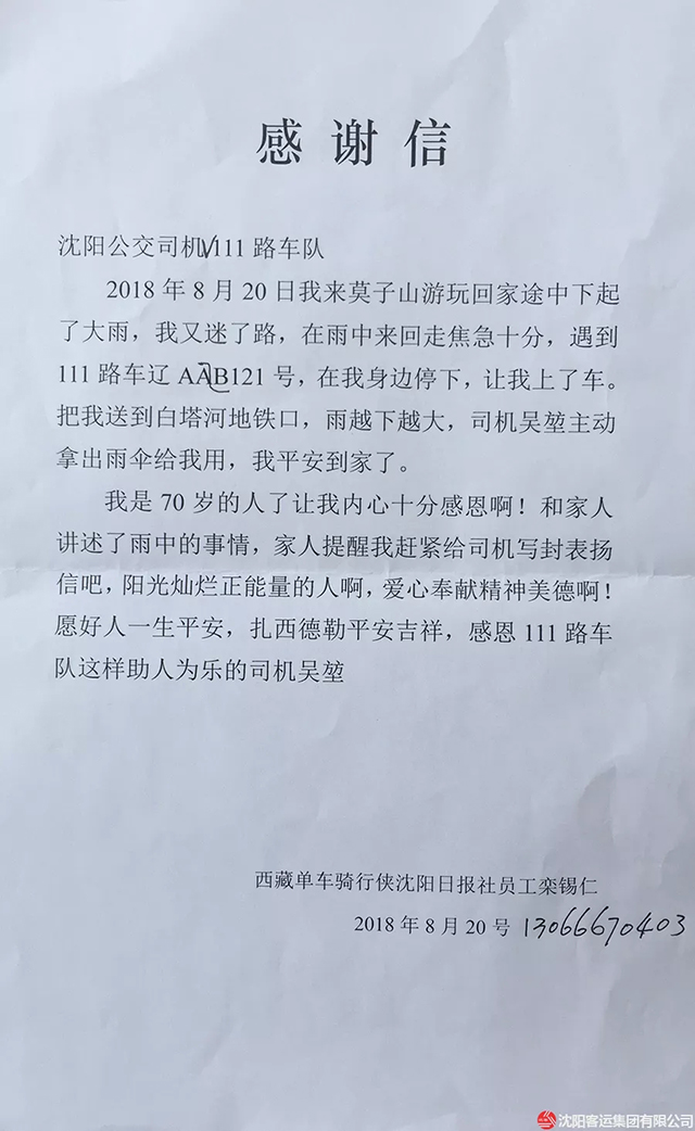 27日一大早,老人來到了鑫暢公司V111車隊,送來了一封感謝信!見到吳坤第一句話就說:“太感謝你了小伙子,如果你那天沒看見我,不送我坐地鐵回家,我今天一定不會安好的站在這里…”說著老人流出了感激的淚水。