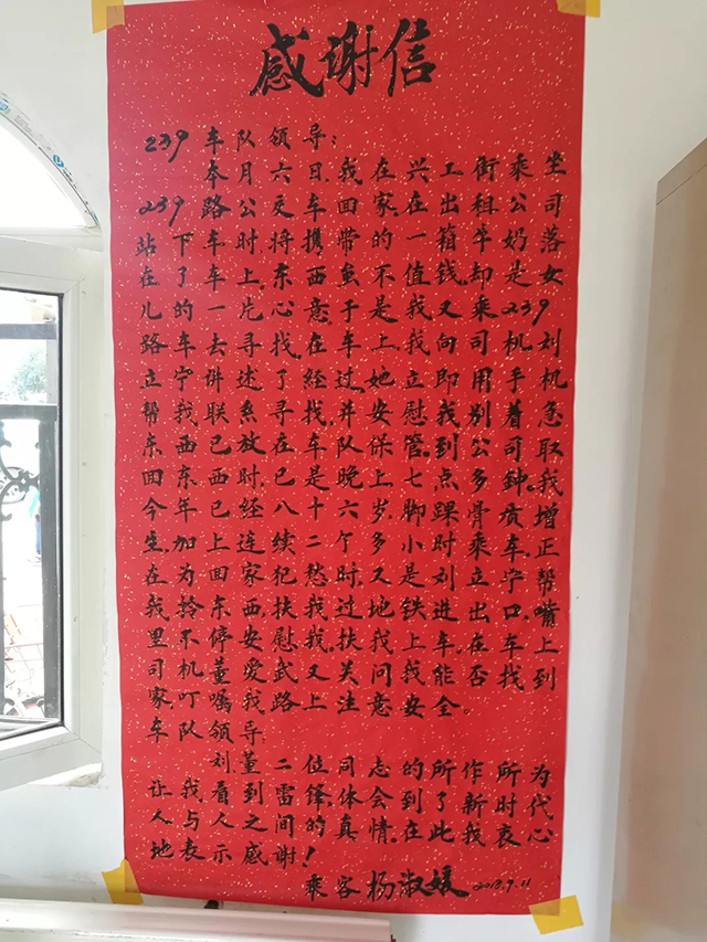 9月11日上午,乘客楊淑媛的女兒把感謝信親自送到康利公司239路車隊站務室,感謝駕駛員劉立寧、董愛武對自己母親的暖心幫助。