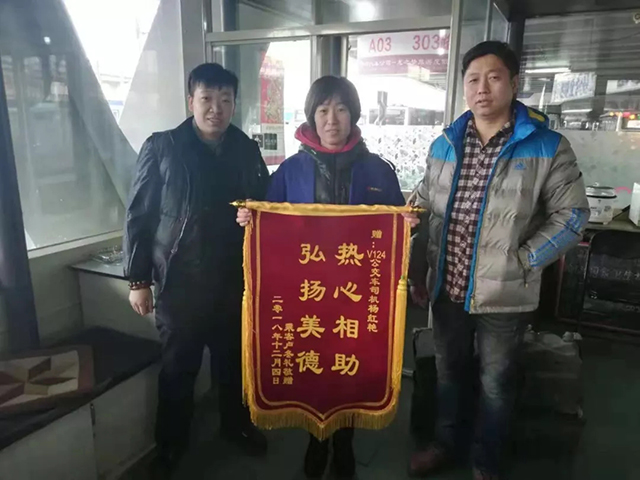 次日,盧女士懷著激動的心情,手里捧著錦旗來到龍之夢終點(diǎn)站,親自將錦旗交給了楊紅艷手中并合影留念。